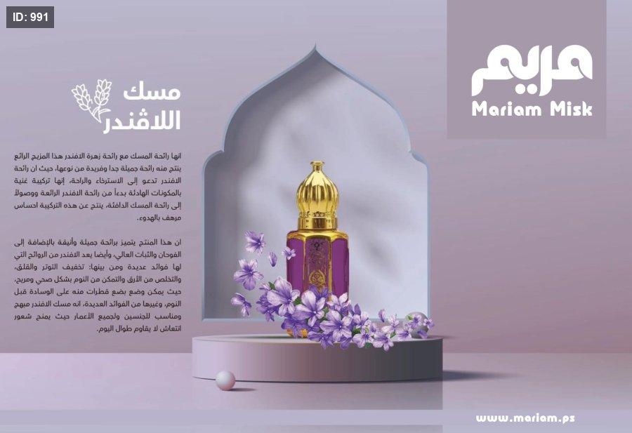 انها رائحة المسك مع رائحة زهرة الافندر هذا المزيج الرائع ينتج منه رائحة جميلة جدا وفريدة من نوعها، حيث ان رائحة الافندر تدعو إلى الاسترخاء والراحة، إنها تركيبة غنية بالمكونات الهادئة بدءا من رائحة الافندر الرائعة ووصولا إلى رائحة المسك الدافئة، ينتج عن هذه التركيبة احساس مرهف بالهدوء، ان هذا المنتج يتميز برائحة جميلة وأنيقة بالإضافة إلى الفوحان والثبات العالي، وأيضا يعد الافندر من الروائح التي لها فوائد عديدة ومن بينها: تخفيف التوتر والقلق، والتخلص من الأرق والتمكن من النوم بشكل صحي ومريح، حيث يمكن وضع بضع قطرات منه على الوسادة قبل النوم, وغيرها من الفوائد العديدة, انه مسك الافندر مبهج ومناسب للجنسين ولجميع الأعمار حيث يمنح شعور انتعاش لا يقاوم طوال اليوم.